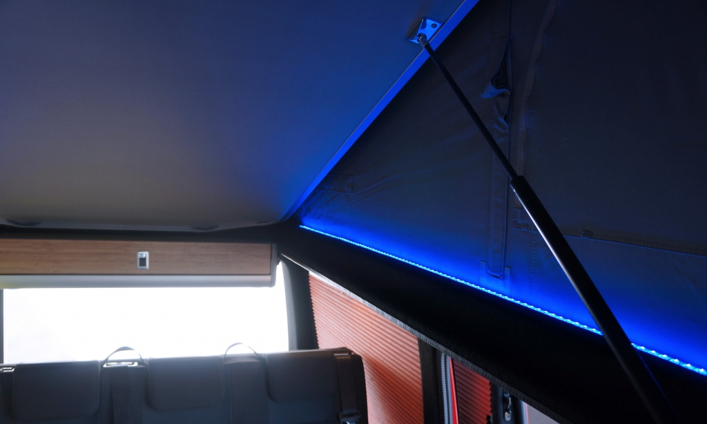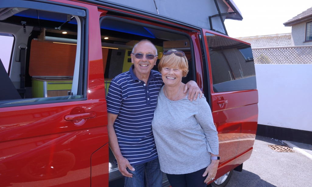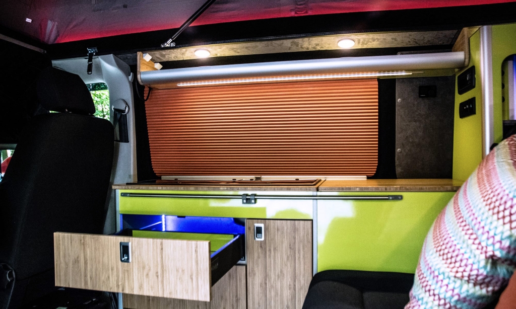 Jean and Roy Ladd ticked most boxes when it came to designing their dream campervan. They chose bold and brave colours to suit their taste and make it a fun van to travel both home and abroad. Little luxuries were added in the form of Caravelle stainless steel side steps and colour changing lights in the roof and cupboards without forgetting the space saving Webasto 41 litre top drawer fridge for Jean’s gin and Roy’s ales.